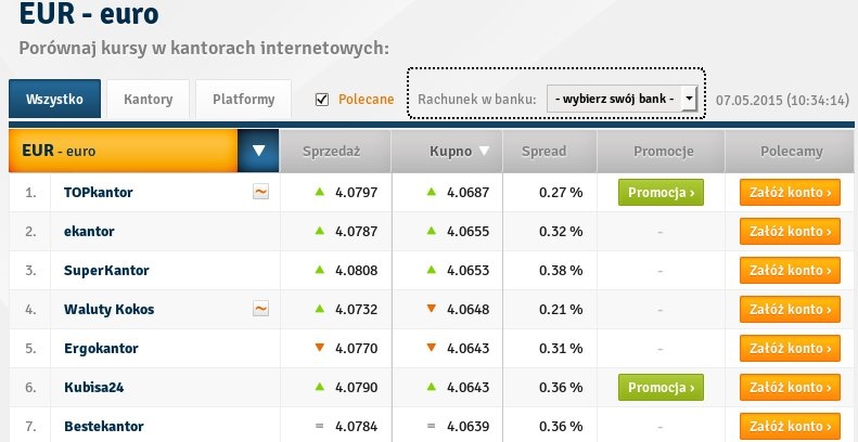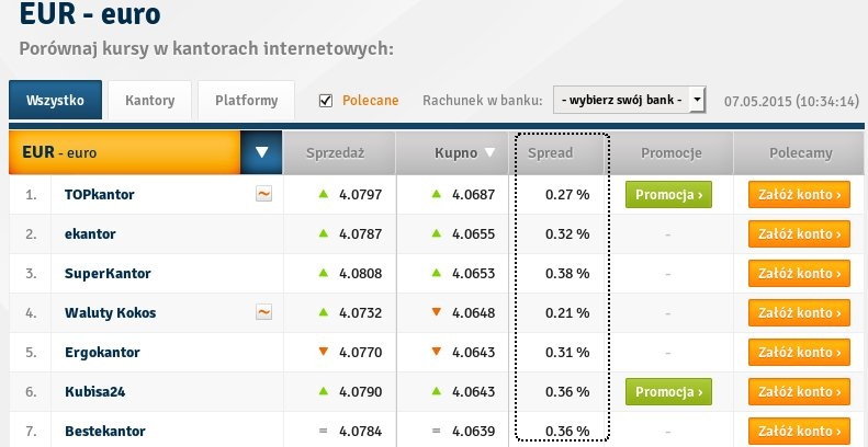 Cena ta w sieci jest tak zbliżona, że wybór 5. albo nawet 10. (zamiast 1.) kantoru z listy uszeregowanej po kursie może oznaczać „stratę” kilku złotych na całkiem dużej transakcji (powiedzmy 1000 EUR/USD/CHF).